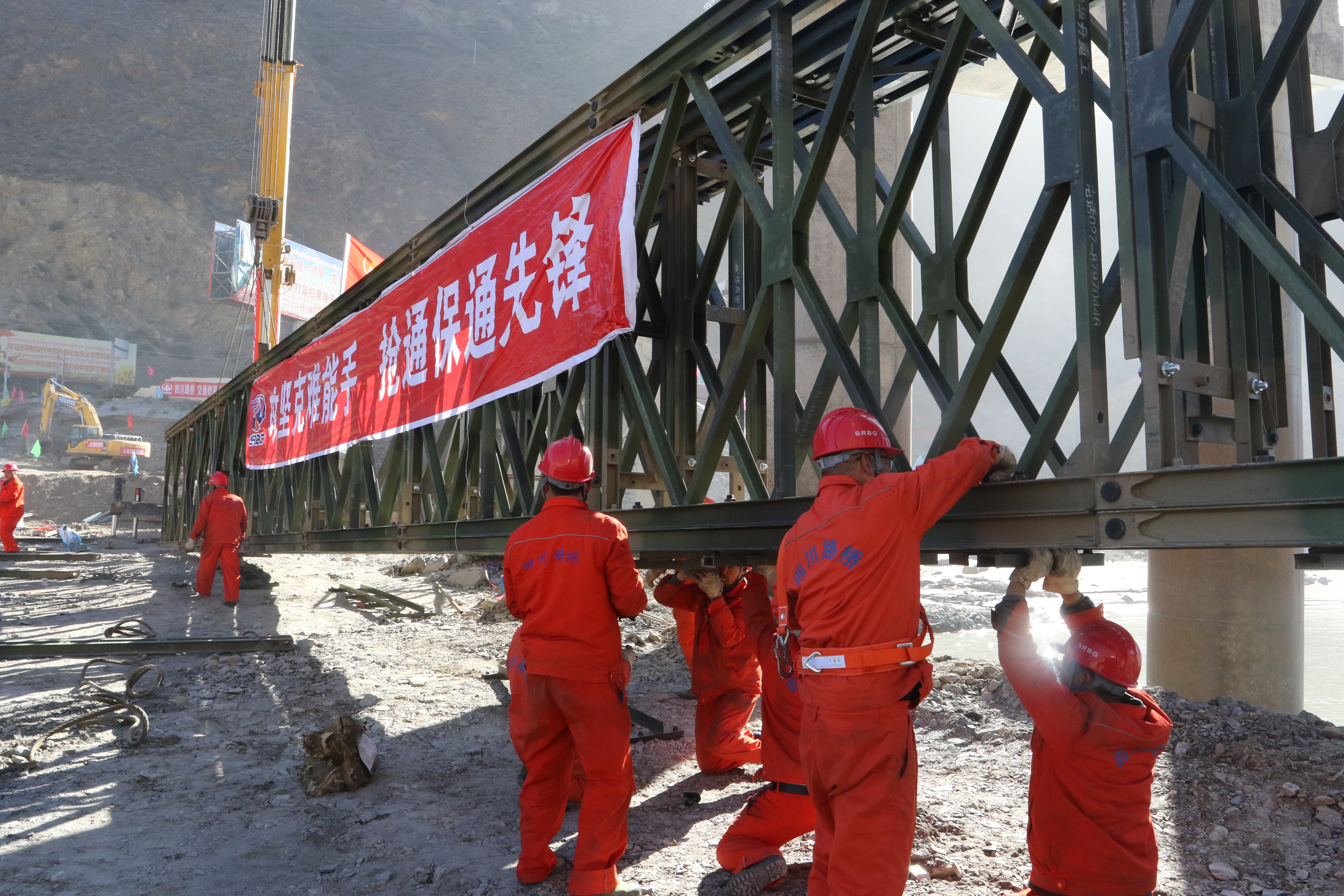 自11月24日8时开始钢栈桥拼装以来,四川pg麻将胡了app官网抢险队积极作为,勇于继续,冒着山体滚石隐患,顶着狂风飞沙严寒,无论治理人员照旧工人至少每天事情18小时,一双双通红眼睛里有疲惫,但更多的是满满的抢通激情。