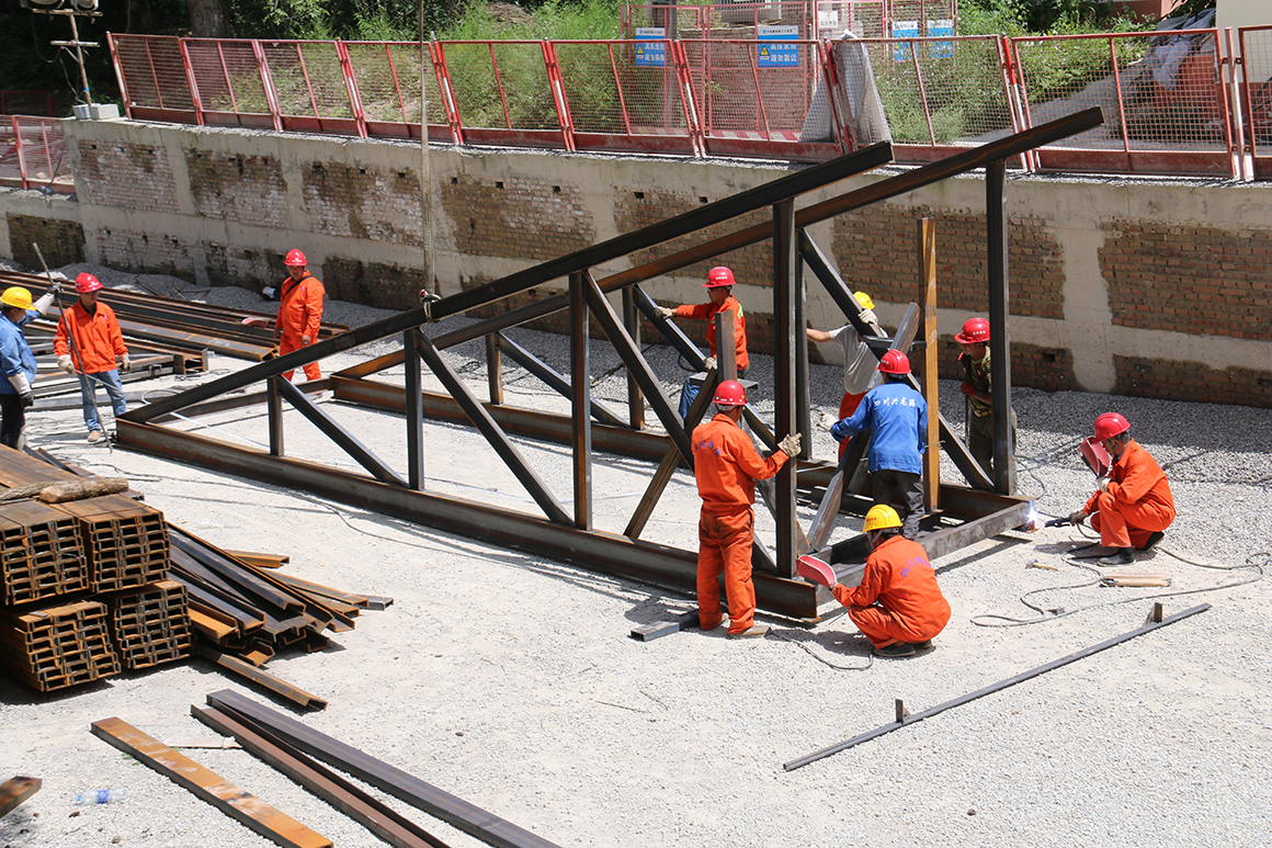 本次由四川pg麻将胡了app官网抢险突击队卖力抢修的钢棚洞,宽8米,高6米,顶棚为一个高差3米的斜面,在靠近山体和门路外侧的两边,用一根根直径半米粗的铁柱,托起一个三角形的顶棚。顶棚的顶面分为三层,第一层用5毫米的钢板,第二层用30厘米厚的弹性泡沫,第三层再用10毫米的钢板拼接。钢制顶面自己已具有很强的抗攻击力,再加上设计为倾斜的顶棚,即便有中小型飞石坠落到钢棚洞,也会顺着斜坡滚落到河沟里。下午,在抢险突击队的有序组织下,通过吊车、自卸车将已焊接加工完成的7个单位钢棚架转运到钢棚洞拼接施工现场。正在准备拼装作业时突发暴雨,由于拼装现场位于山体垮塌严重地段,为包管施工宁静,拼装作业延缓至第二天进行。