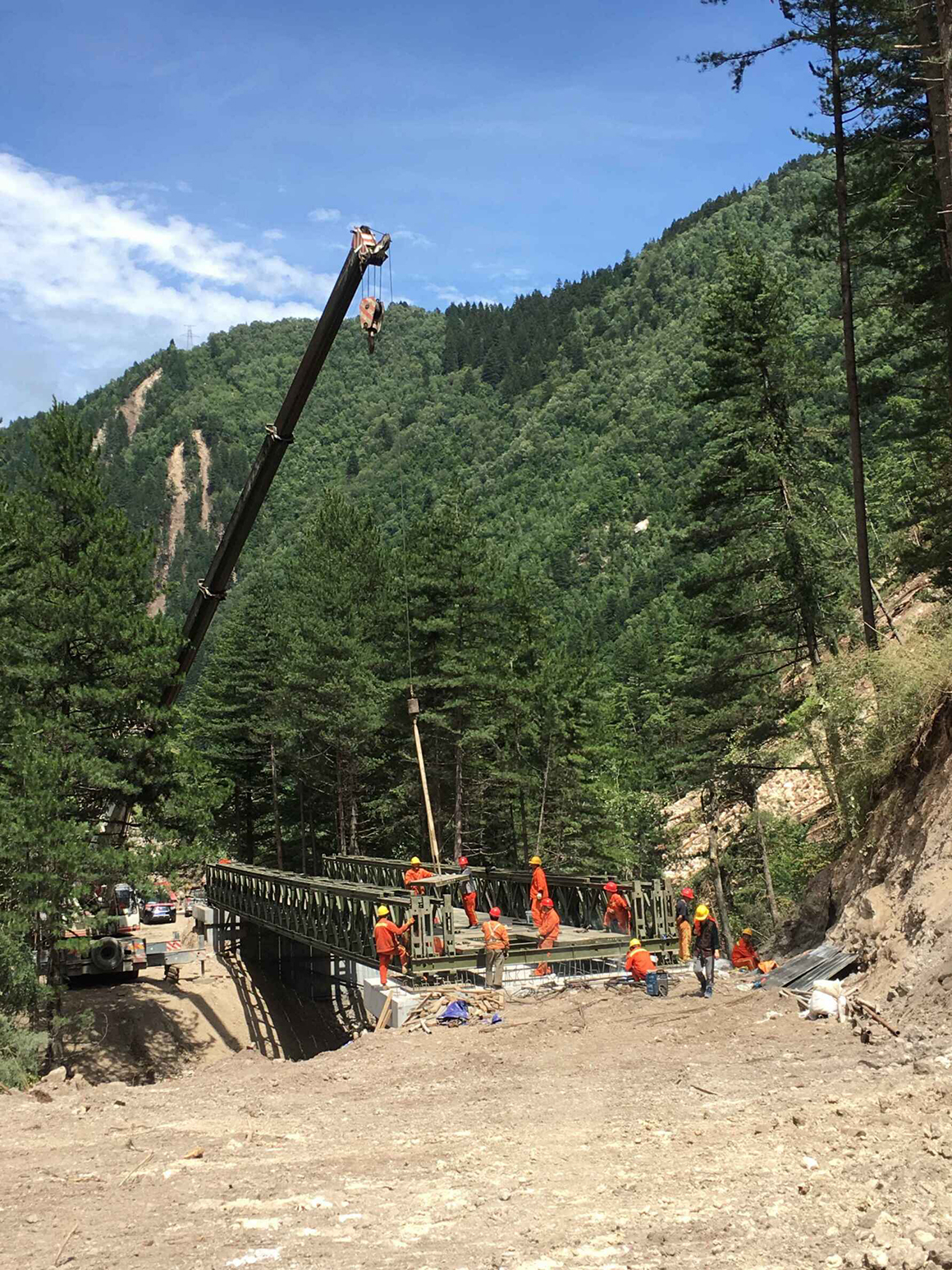 在8月16日下午正式收到设计院钢架桥设计图之后,四川pg麻将胡了app官网抢通保通队员迅速行动,准备钢架桥拼装所需要的物资设备。因位于河下游的1号桥,桥台设计高程与原地面相差较大,抢修步队决定先抢修2号钢桥,同时对1号桥的桥台按设计进行挖填。
