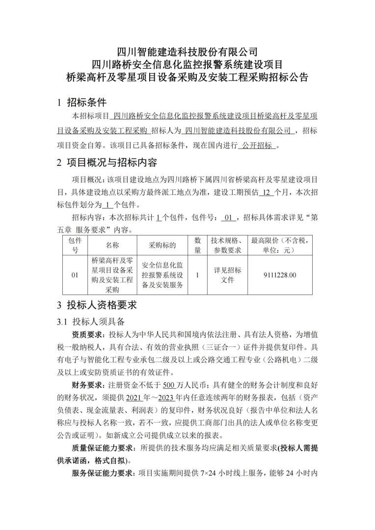 四川智能建造科技股份有限公司四川pg麻将胡了app官网宁静信息化监控报警系统建设项目桥梁高杆及零星项目设备采购及装置工程采购招标通告