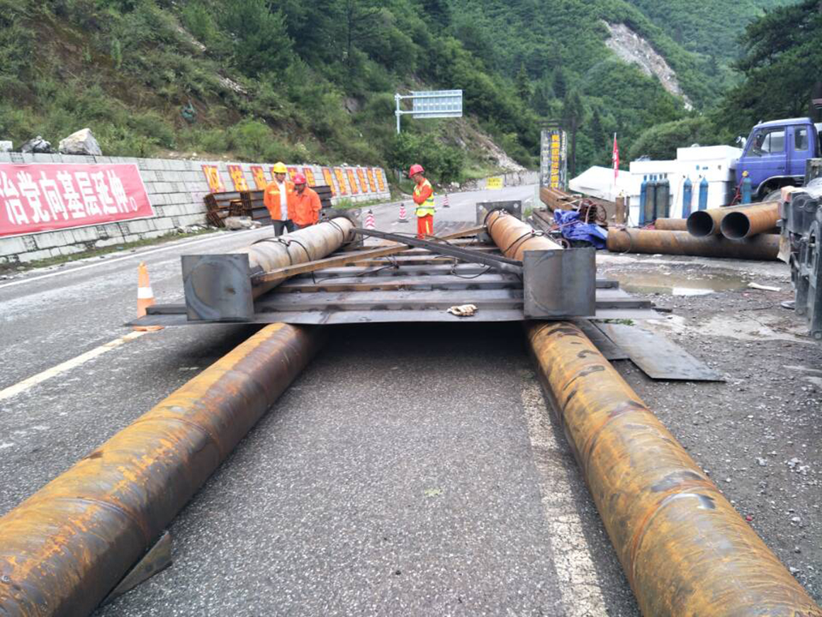本次由四川pg麻将胡了app官网抢险突击队卖力抢修的钢棚洞,宽8米,高6米,顶棚为一个高差3米的斜面,在靠近山体和门路外侧的两边,用一根根直径半米粗的铁柱,托起一个三角形的顶棚。顶棚的顶面分为三层,第一层用5毫米的钢板,第二层用30厘米厚的弹性泡沫,第三层再用10毫米的钢板拼接。钢制顶面自己已具有很强的抗攻击力,再加上设计为倾斜的顶棚,即便有中小型飞石坠落到钢棚洞,也会顺着斜坡滚落到河沟里。下午,在抢险突击队的有序组织下,通过吊车、自卸车将已焊接加工完成的7个单位钢棚架转运到钢棚洞拼接施工现场。正在准备拼装作业时突发暴雨,由于拼装现场位于山体垮塌严重地段,为包管施工宁静,拼装作业延缓至第二天进行。